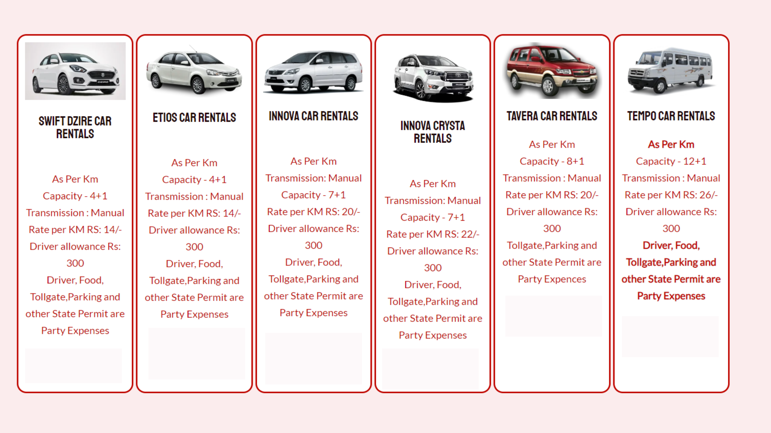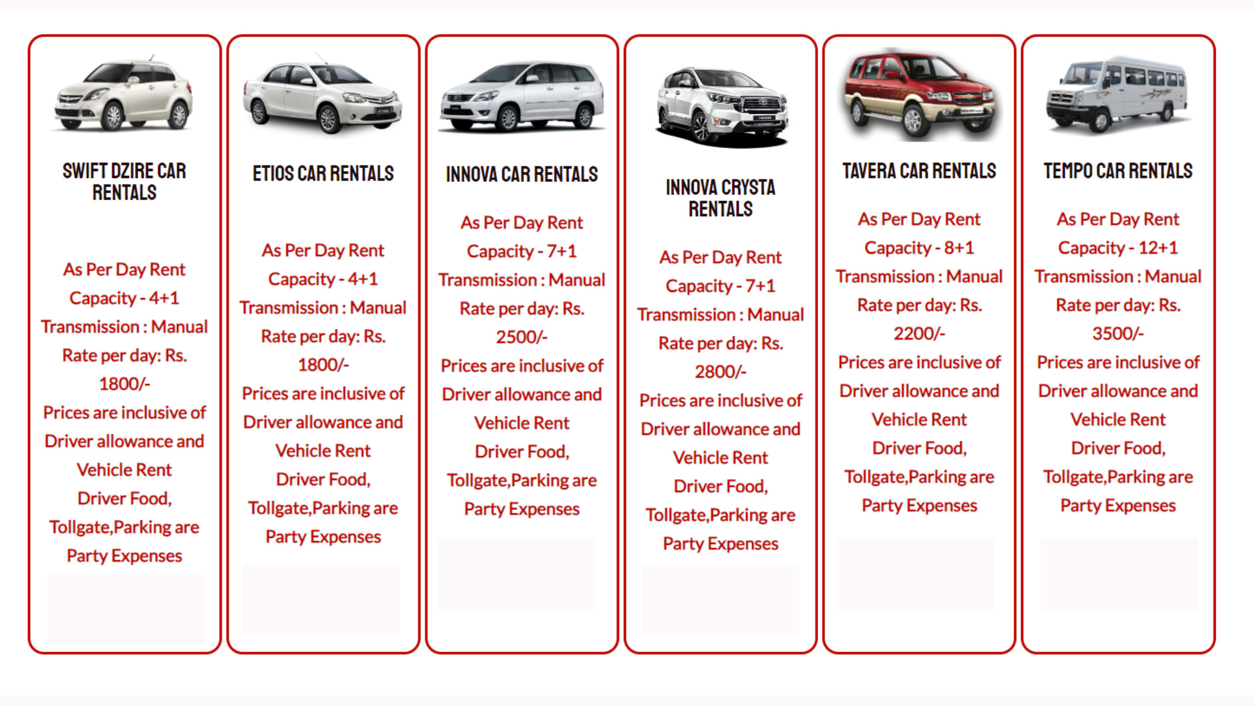 Our website includes detailed descriptions of various rental packages, different price plans, different segments and so on to match the preferences of customers. The vehicle service duration is around 10 to 12 hours in a day. When we say a day rent, usually customers think it is for 24 hours, but it is not. For example, if customer hires our car today around 4 pm and release it on next day 10 am. We consider vehicle rent for two days. The reason behind it is when the day changes the payments like driver charge, vehicle maintainance etc has to be paid.